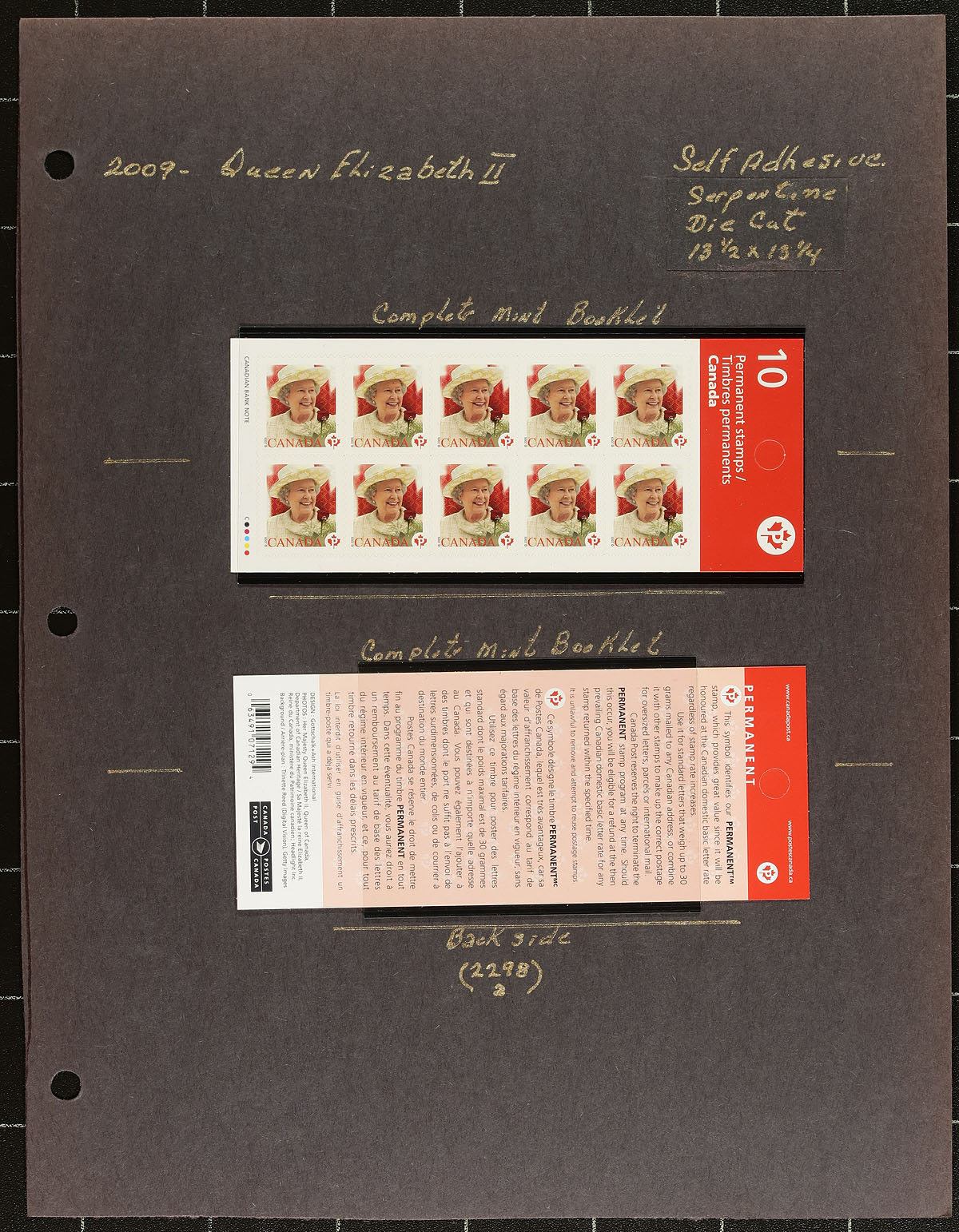 In-depth collection of primarily mint never hinged definitive issues, January 2009, covering Unitrade #s 2298-2313, all in hingeless mounts in roughly 20 well described pages. The collection contains mint and used singles (including booklet stamps), booklets, souvenir sheets, coil singles, pairs, and strips of 4, along with a few first day covers. We note some better items cataloguing $15.00 and up. Face value alone totals $269.00 (includes 146x "P" stamps). A nice comprehensive collection that would be difficult to duplicate. 2024 Unitrade =