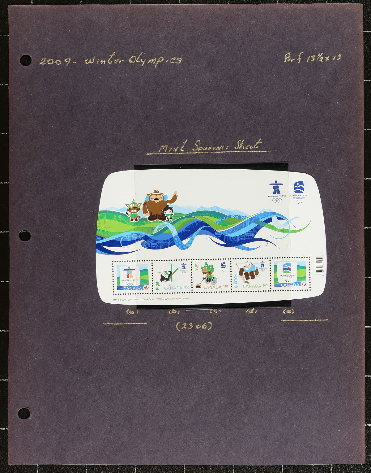 In-depth collection of primarily mint never hinged definitive issues, January 2009, covering Unitrade #s 2298-2313, all in hingeless mounts in roughly 20 well described pages. The collection contains mint and used singles (including booklet stamps), booklets, souvenir sheets, coil singles, pairs, and strips of 4, along with a few first day covers. We note some better items cataloguing $15.00 and up. Face value alone totals $269.00 (includes 146x "P" stamps). A nice comprehensive collection that would be difficult to duplicate. 2024 Unitrade =