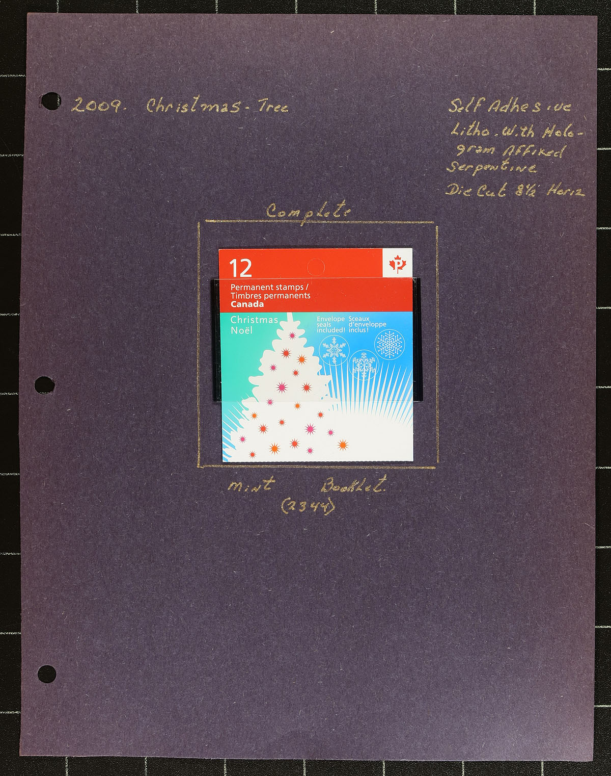Lovely collection of primarily mint never hinged "Christmas" issues, November 2009, covering Unitrade #s 2343-2347, all in hingeless mounts in roughly 20 well described pages. The collection contains mint and used singles (including booklet stamps), booklets, souvenir sheets, along with roughly 13 first day covers (most having Lower Mainland B.C. postmarks from a variety of outlets). We note a few better items cataloguing $15.00 and up. Face value alone totals $102.00 (includes 53x "P" stamps). A nice collection suitable for all collectors. 2024 Unitrade =