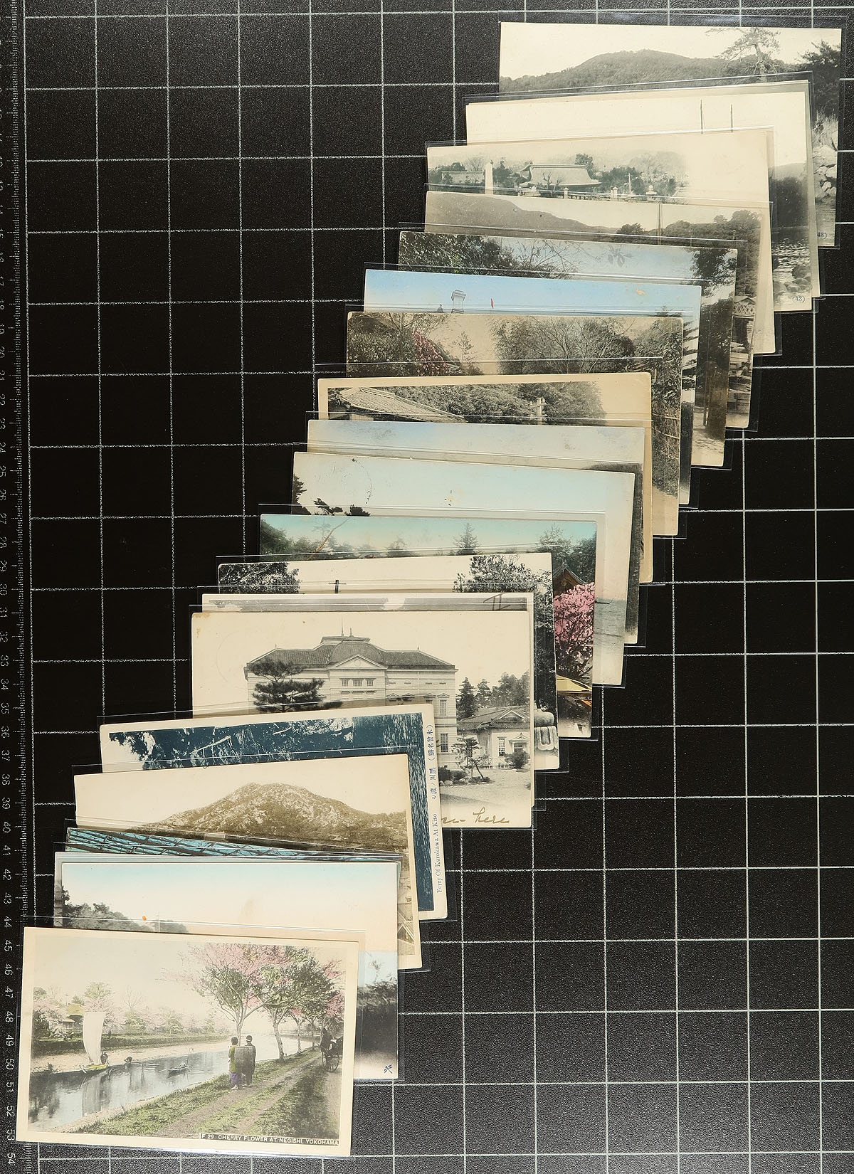Japan, a treasure trove of vintage postcards, most from the classic era of postcards (1905-1920). A total of 131 cards, with many better including hand-painted, hand-tinted, Japanese Ladies, Shrines, landscape and building views. A great variety of material, collected individually over many years by a local Victoria collector. Mosty unused, but with the odd used as well. Large lots of these cards are seldom seen. Offered as received. Estimate =