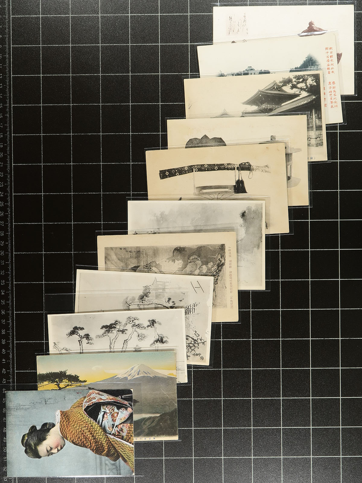 Japan, a treasure trove of vintage postcards, most from the classic era of postcards (1905-1920). A total of 131 cards, with many better including hand-painted, hand-tinted, Japanese Ladies, Shrines, landscape and building views. A great variety of material, collected individually over many years by a local Victoria collector. Mosty unused, but with the odd used as well. Large lots of these cards are seldom seen. Offered as received. Estimate =