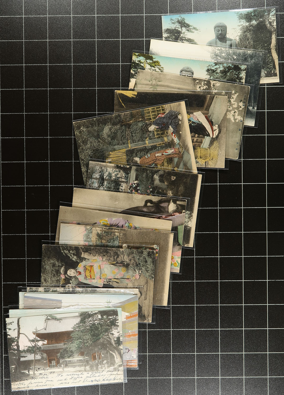 Japan, a treasure trove of vintage postcards, most from the classic era of postcards (1905-1920). A total of 131 cards, with many better including hand-painted, hand-tinted, Japanese Ladies, Shrines, landscape and building views. A great variety of material, collected individually over many years by a local Victoria collector. Mosty unused, but with the odd used as well. Large lots of these cards are seldom seen. Offered as received. Estimate =