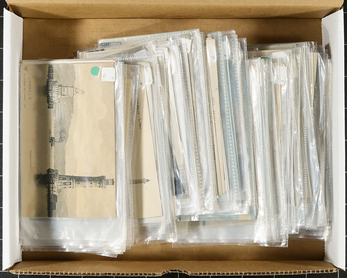 Lighthouse / Light Station Topical Accumulation. A collector's accumulation of 124 postcards featuring a theme of Lighthouses or Light Stations. Primarily European, with particular strength in Isle of Wight, but also noted other locations such as Ceylon, Egypt, Suez Canal, Gibraltar, Jamaica and USA (including a Hawaii postcard). Most are still in the original sleeve from when purchased, with many priced in the $10.00-$15.00 range. An excellent opportunity to acquire a large specialized holding which would take years to assemble. Estimate =