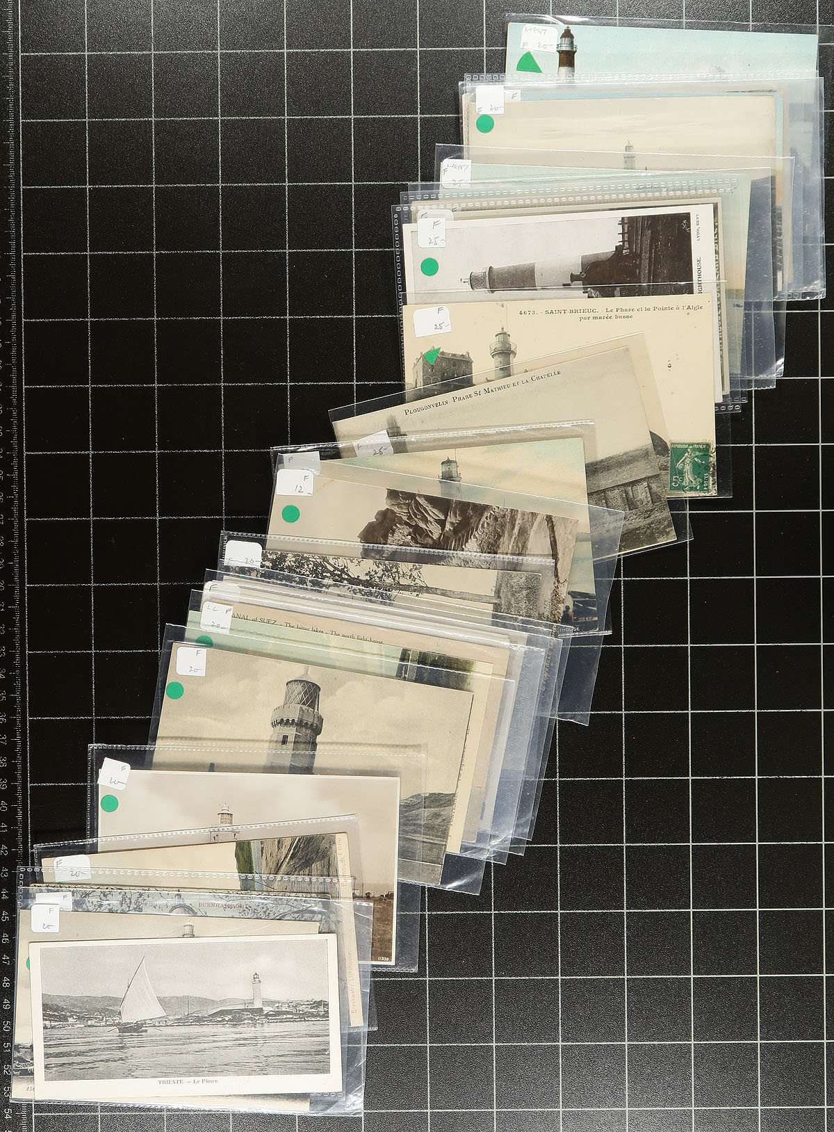 Lighthouse / Light Station Topical Accumulation. A collector's accumulation of 124 postcards featuring a theme of Lighthouses or Light Stations. Primarily European, with particular strength in Isle of Wight, but also noted other locations such as Ceylon, Egypt, Suez Canal, Gibraltar, Jamaica and USA (including a Hawaii postcard). Most are still in the original sleeve from when purchased, with many priced in the $10.00-$15.00 range. An excellent opportunity to acquire a large specialized holding which would take years to assemble. Estimate =