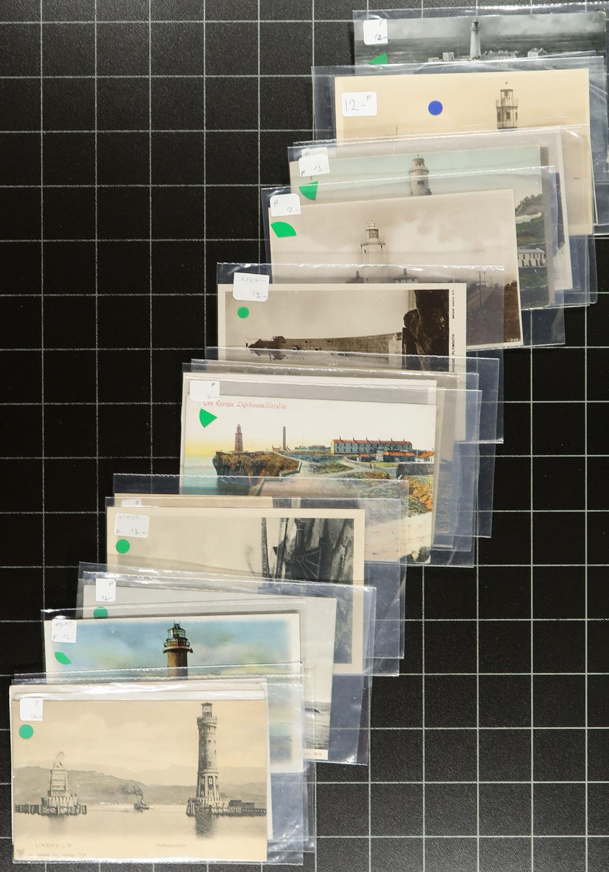 Lighthouse / Light Station Topical Accumulation. A collector's accumulation of 124 postcards featuring a theme of Lighthouses or Light Stations. Primarily European, with particular strength in Isle of Wight, but also noted other locations such as Ceylon, Egypt, Suez Canal, Gibraltar, Jamaica and USA (including a Hawaii postcard). Most are still in the original sleeve from when purchased, with many priced in the $10.00-$15.00 range. An excellent opportunity to acquire a large specialized holding which would take years to assemble. Estimate =