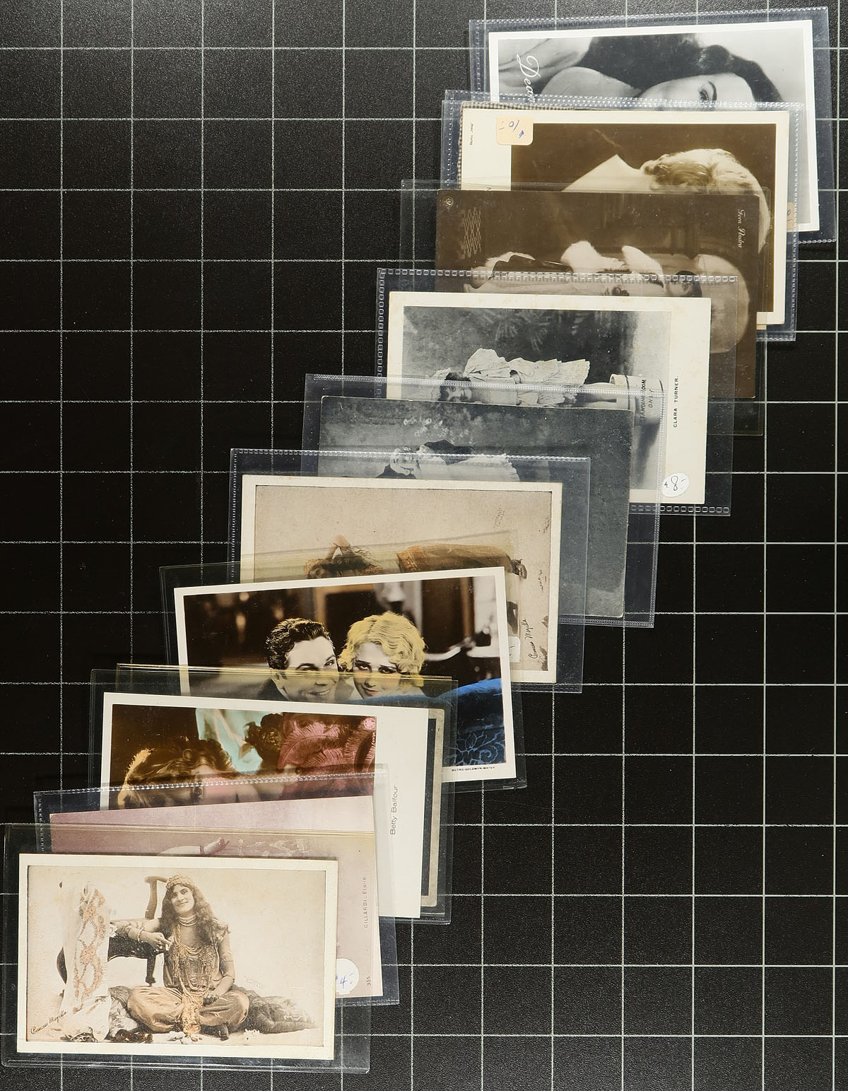 Stars & Starlets of the Screen. A wonderful group of 86 postcards, acquired by a collector to feature the Actors and Actresses from a golden age of movies / entertainment (including the stage). Noted many "glamour" shots, along with "in-costume" views with some of the most prominent actors of the period. Most still in the original sleeves from when purchased, with many being priced from $10.00-$15.00 (from decades ago). While some of the plastic protective sleeves have yellowed, the postcards within are just fine. A nice opportunity here, as it would take a significant amount of time and money to assemble this holding! Estimate =