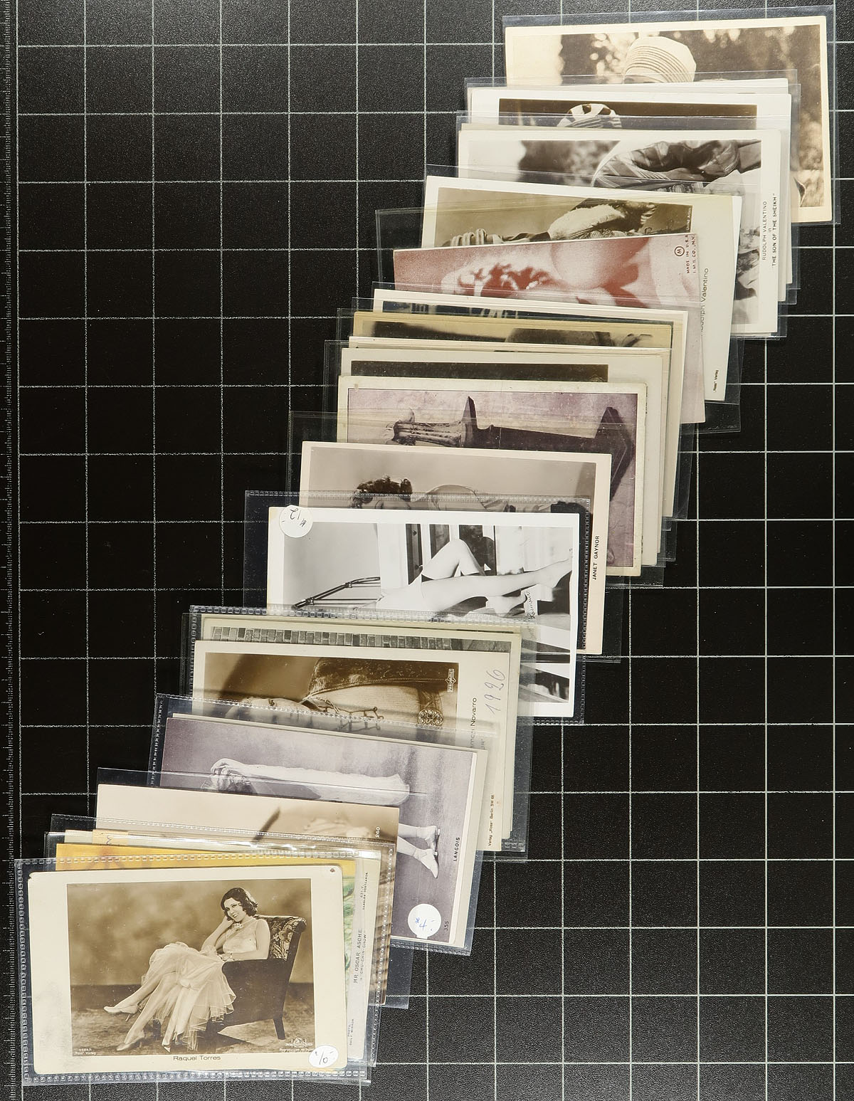 Stars & Starlets of the Screen. A wonderful group of 86 postcards, acquired by a collector to feature the Actors and Actresses from a golden age of movies / entertainment (including the stage). Noted many "glamour" shots, along with "in-costume" views with some of the most prominent actors of the period. Most still in the original sleeves from when purchased, with many being priced from $10.00-$15.00 (from decades ago). While some of the plastic protective sleeves have yellowed, the postcards within are just fine. A nice opportunity here, as it would take a significant amount of time and money to assemble this holding! Estimate =