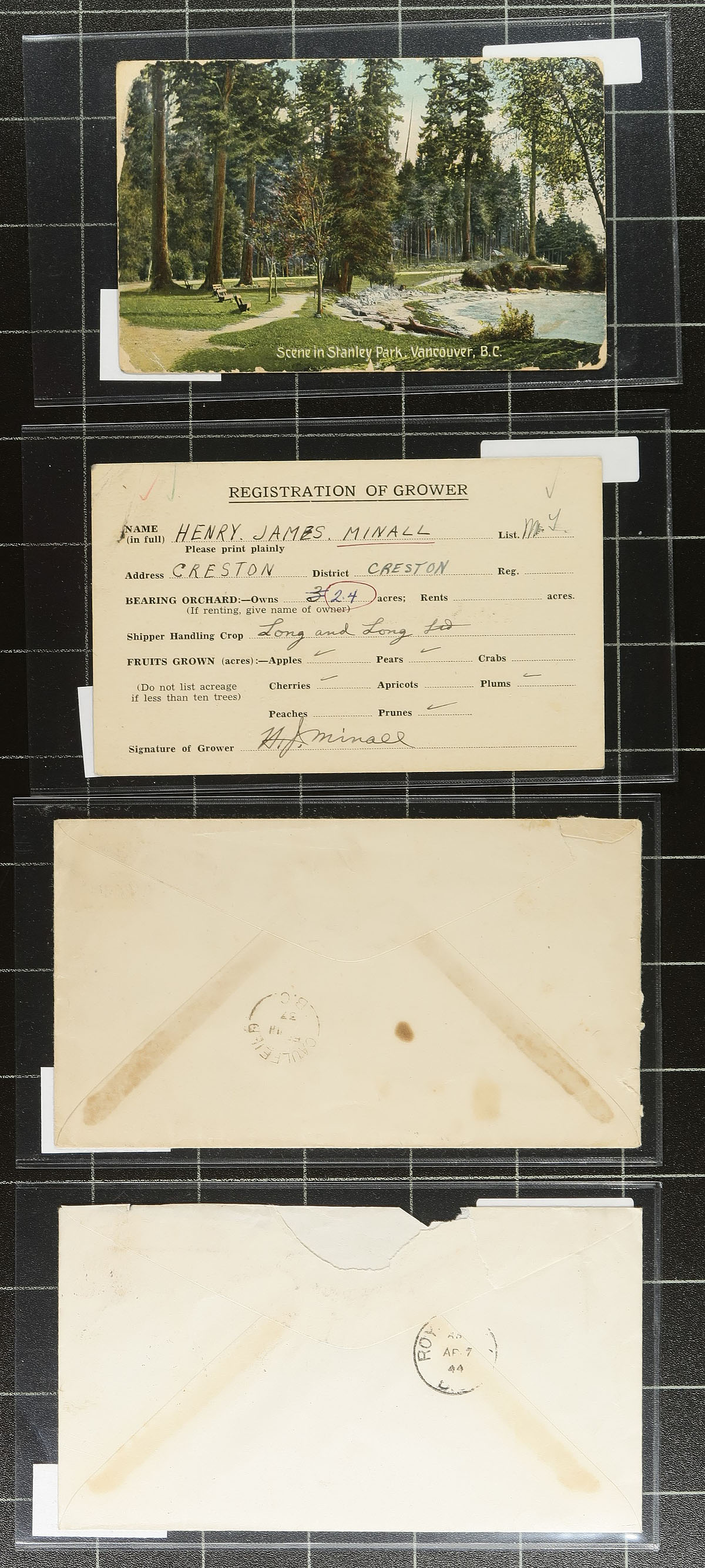 British Columba Postal History "Bakers Dozen" Part 2. A second helping of diverse postal history with a focus on British Columbia. Lot includes Midway 1905 CDS postcard, split ring cancels from Maywood / Blue River / Roberts Creek / Coquitlam, Prospect Lake / Langley / Erickson / Caulfield, Revelstoke 1901 CDS, Windermere 1916-1918 (four incoming from Ottawa, House of Commons), Provincial Cannery 1955 CDS and a Vancouver S.O. Cedar Cottage 1915 CDS. Interesting and sure to please any postmark hound. Each item is individually sleeved and priced. Total retail as marked =