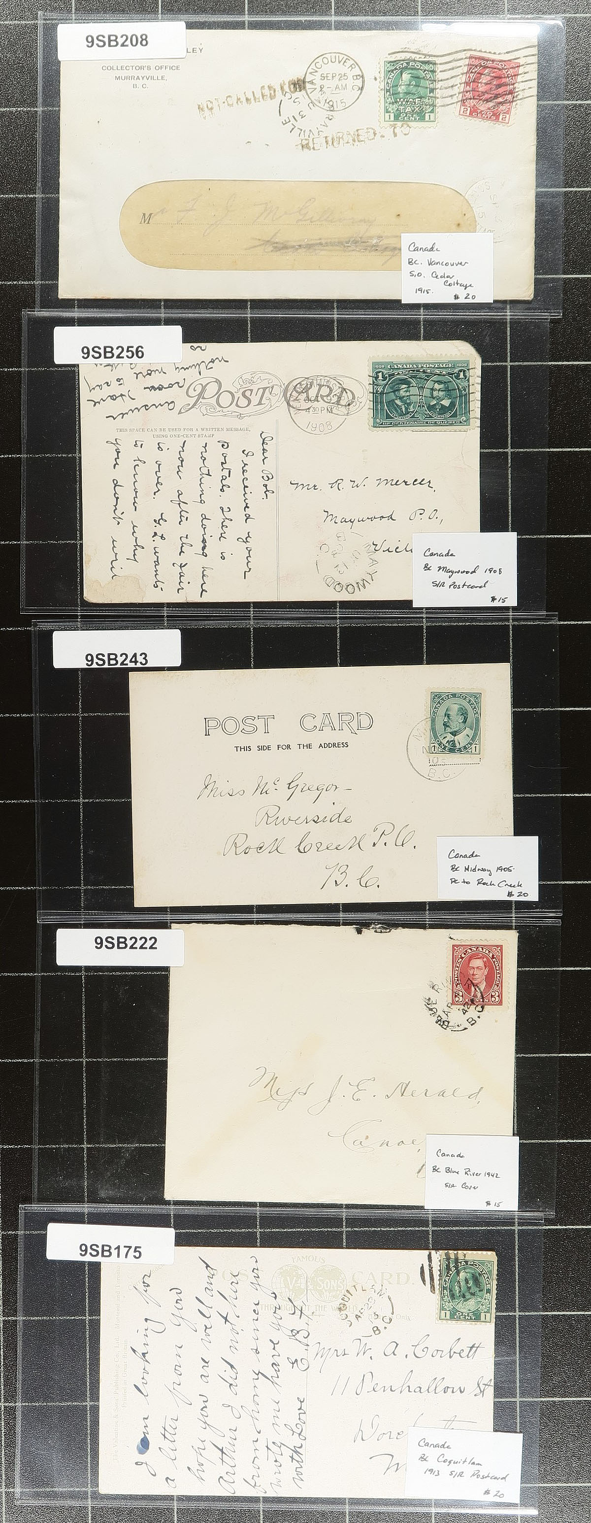British Columba Postal History "Bakers Dozen" Part 2. A second helping of diverse postal history with a focus on British Columbia. Lot includes Midway 1905 CDS postcard, split ring cancels from Maywood / Blue River / Roberts Creek / Coquitlam, Prospect Lake / Langley / Erickson / Caulfield, Revelstoke 1901 CDS, Windermere 1916-1918 (four incoming from Ottawa, House of Commons), Provincial Cannery 1955 CDS and a Vancouver S.O. Cedar Cottage 1915 CDS. Interesting and sure to please any postmark hound. Each item is individually sleeved and priced. Total retail as marked =