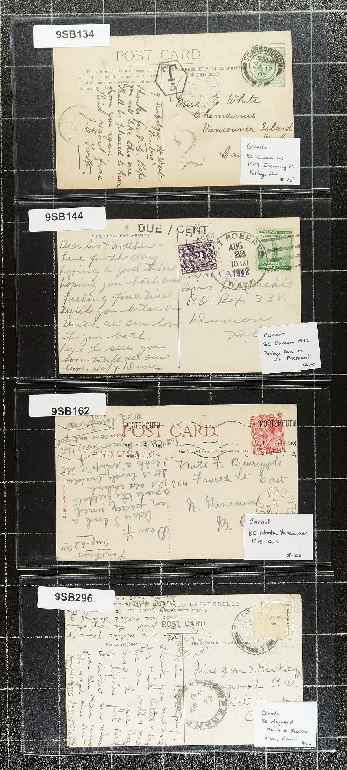 British Columba Postal History "Bakers Dozen" Part 3. The final installment of the "bakers dozens" with BC postmarks. This lot includes North Vancouver 1913 CDS, split ring cancels from Vallican / Adams Lake / Erickson / Mayood, Victoria 1909 Dominion Hotel, Vancouver 1920 CDS (posted at Surf Inlet), Kelowna 1909 CDS, 1896 CPR RPO on pair of 1c Small Queens, Wells 1947 (Island Mountain Mines Cover), Chemainus 1907 CDS postage due postcard, Duncan 1942 postage due postcard and an unusual "Eastport & Spokane" RPO (USA) on cover posted from Kingsgate BC 1935 (border town). Each item is individually sleeved and priced. Total retail as marked =