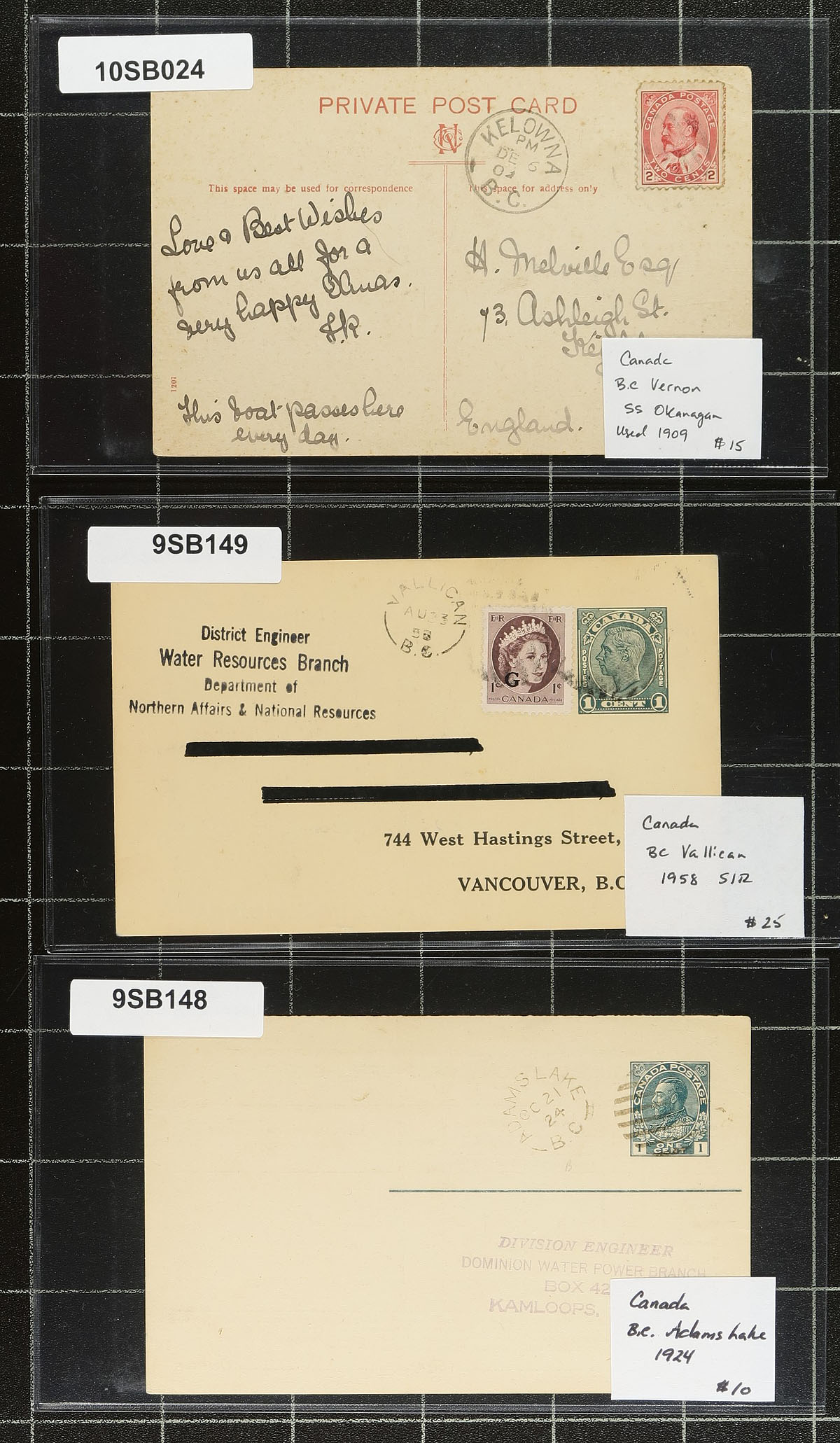 British Columba Postal History "Bakers Dozen" Part 3. The final installment of the "bakers dozens" with BC postmarks. This lot includes North Vancouver 1913 CDS, split ring cancels from Vallican / Adams Lake / Erickson / Mayood, Victoria 1909 Dominion Hotel, Vancouver 1920 CDS (posted at Surf Inlet), Kelowna 1909 CDS, 1896 CPR RPO on pair of 1c Small Queens, Wells 1947 (Island Mountain Mines Cover), Chemainus 1907 CDS postage due postcard, Duncan 1942 postage due postcard and an unusual "Eastport & Spokane" RPO (USA) on cover posted from Kingsgate BC 1935 (border town). Each item is individually sleeved and priced. Total retail as marked =
