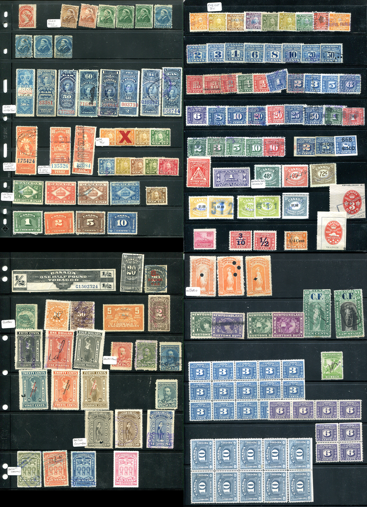 A Canadian Revenue Stamp "sampler" as received from a collector. Includes Federal issues such as Bill Stamps, Gas Inspection, Electric Light Inspection, Customs Duty, War Tax, Excise Tax, Unemployment Insurance and Provincial issues which include material from Quebec, Newfoundland, BC, Saskatchewan and Ontario. A mix of unused and unused, with the odd small fault and some minor duplication. All arranged on two double-sided stockpages. Owner's 2022 van Dam =