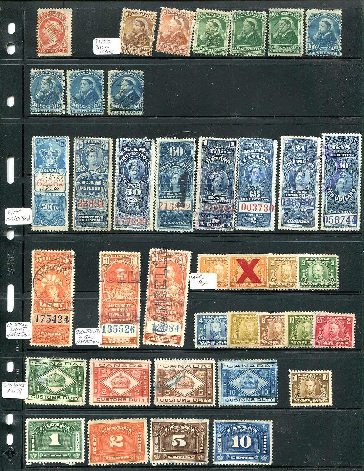 A Canadian Revenue Stamp "sampler" as received from a collector. Includes Federal issues such as Bill Stamps, Gas Inspection, Electric Light Inspection, Customs Duty, War Tax, Excise Tax, Unemployment Insurance and Provincial issues which include material from Quebec, Newfoundland, BC, Saskatchewan and Ontario. A mix of unused and unused, with the odd small fault and some minor duplication. All arranged on two double-sided stockpages. Owner's 2022 van Dam =