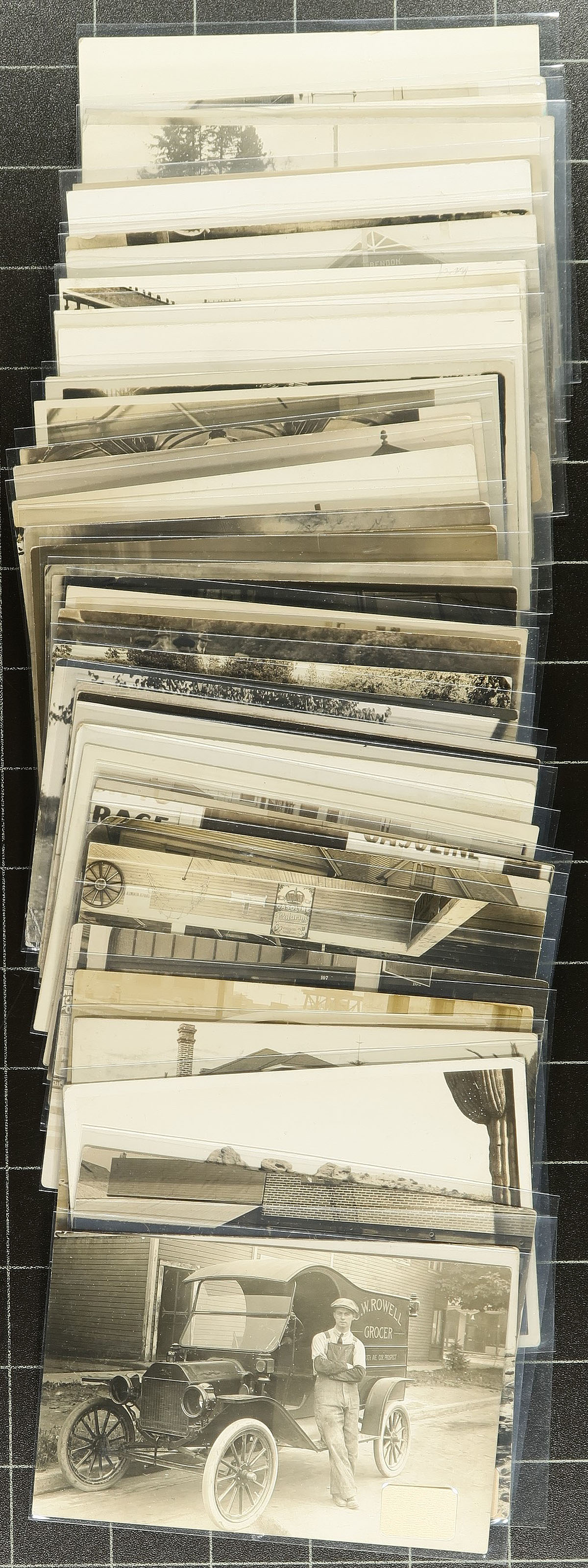 Automotive & Trains PREMIUM Topical Assembly. A stunning offering of RPPC (Real Photo Postcards) featuring early Automotive (19 postcards) and Train themes (22 postcards). The automotive postcards feature accidents, hauling lumber, mechanic work, delivery cars etc. The train section includes men working on the railway, trains, railway stations, interior views, construction and even a "Train Time Hobo". A couple stretch the definition, including a street car and a couple "buggies", but included for sake of posterity. A wonderful group of early social history. Well worth the reasonable estimated value. Estimate =