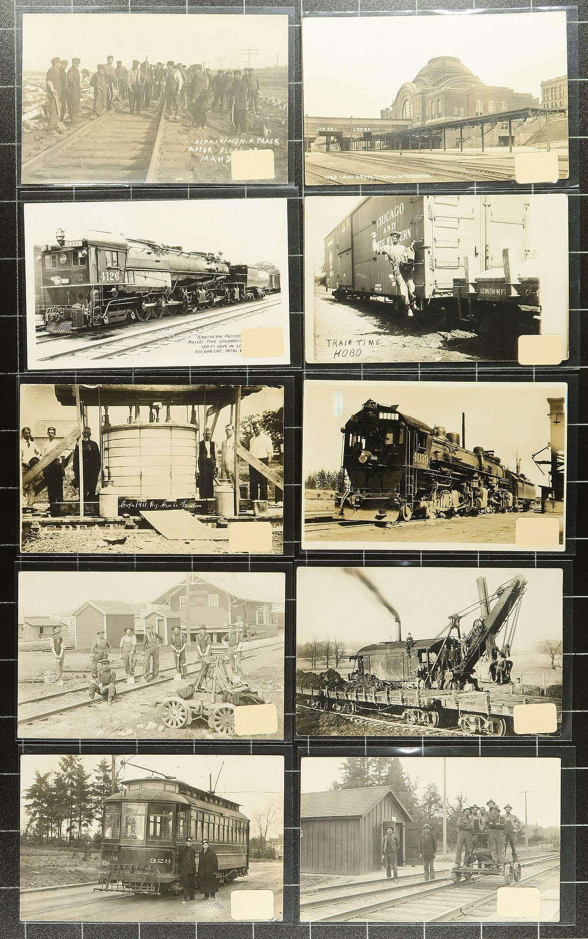 Automotive & Trains PREMIUM Topical Assembly. A stunning offering of RPPC (Real Photo Postcards) featuring early Automotive (19 postcards) and Train themes (22 postcards). The automotive postcards feature accidents, hauling lumber, mechanic work, delivery cars etc. The train section includes men working on the railway, trains, railway stations, interior views, construction and even a "Train Time Hobo". A couple stretch the definition, including a street car and a couple "buggies", but included for sake of posterity. A wonderful group of early social history. Well worth the reasonable estimated value. Estimate =