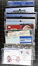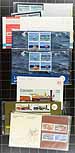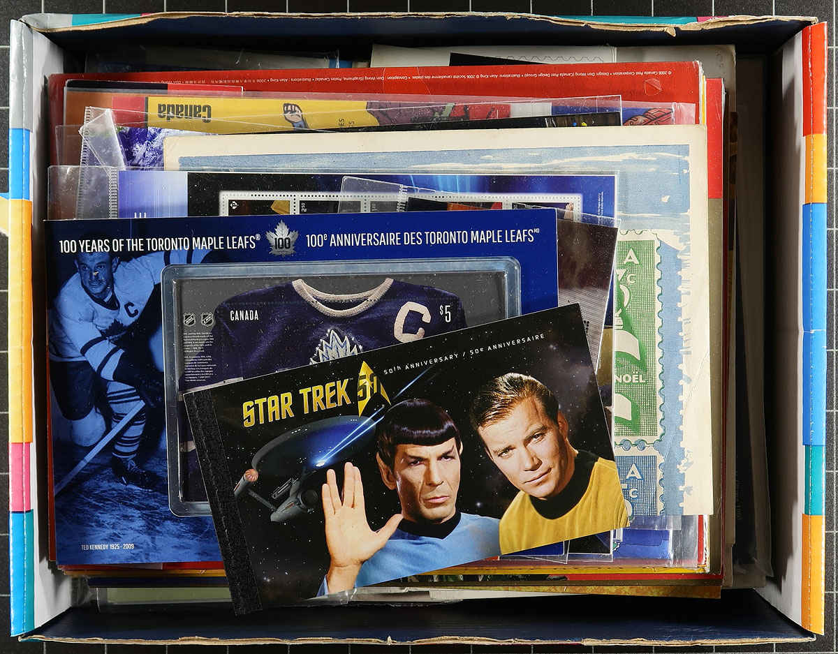 A "catch-all" large shoebox of Canadian Thematic Collections and other often neglected "back of the book" packages. Includes over 100 items, with early Year Sets, Thematic Collections, Promotional Items and even (and likely most interesting) a 1965 Christmas Post Office advertising window flyer (folded). Some of the other notable items are the "Purdys Chocolate envelope, Star Trek Prestige Booklet, Picture Postage P.O. Pack, $5.00 Toronto Maple Leafs Jersey pack and several other modern Post Office packs (including Star Trek). Unitrade has started to list many of these, but some remain unlisted and unpriced. Well worth the estimated value. Estimate =