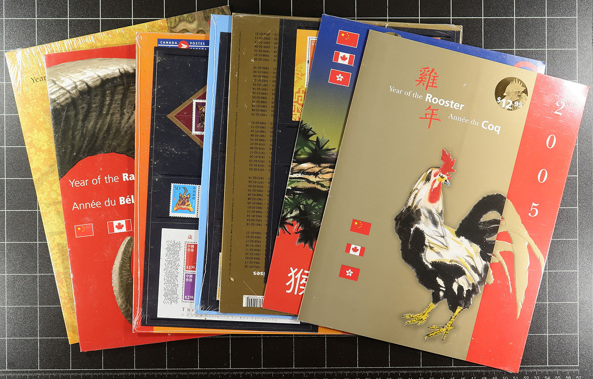 A "catch-all" large shoebox of Canadian Thematic Collections and other often neglected "back of the book" packages. Includes over 100 items, with early Year Sets, Thematic Collections, Promotional Items and even (and likely most interesting) a 1965 Christmas Post Office advertising window flyer (folded). Some of the other notable items are the "Purdys Chocolate envelope, Star Trek Prestige Booklet, Picture Postage P.O. Pack, $5.00 Toronto Maple Leafs Jersey pack and several other modern Post Office packs (including Star Trek). Unitrade has started to list many of these, but some remain unlisted and unpriced. Well worth the estimated value. Estimate =