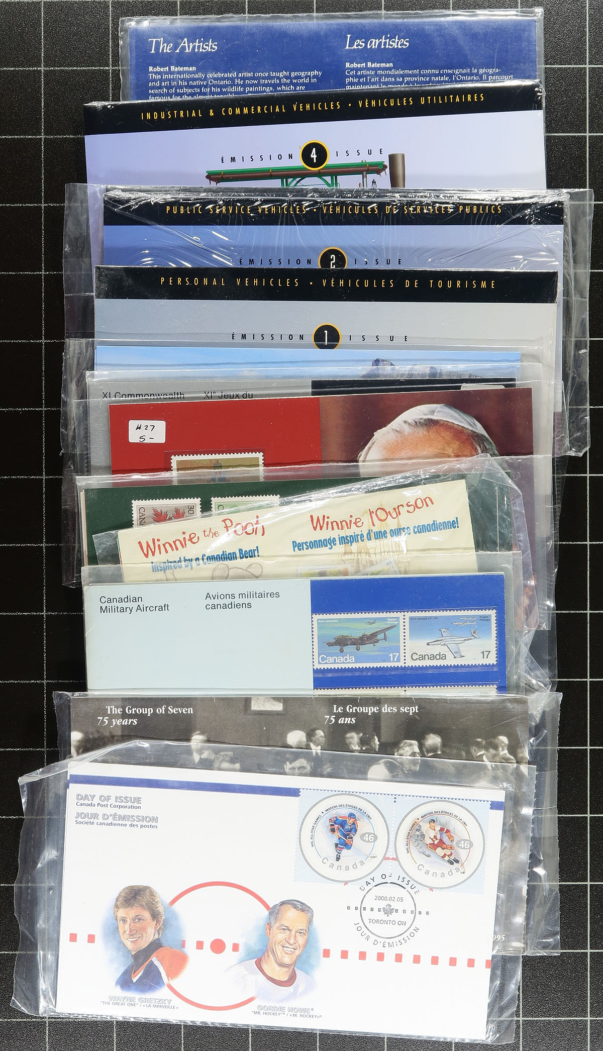 A "catch-all" large shoebox of Canadian Thematic Collections and other often neglected "back of the book" packages. Includes over 100 items, with early Year Sets, Thematic Collections, Promotional Items and even (and likely most interesting) a 1965 Christmas Post Office advertising window flyer (folded). Some of the other notable items are the "Purdys Chocolate envelope, Star Trek Prestige Booklet, Picture Postage P.O. Pack, $5.00 Toronto Maple Leafs Jersey pack and several other modern Post Office packs (including Star Trek). Unitrade has started to list many of these, but some remain unlisted and unpriced. Well worth the estimated value. Estimate =