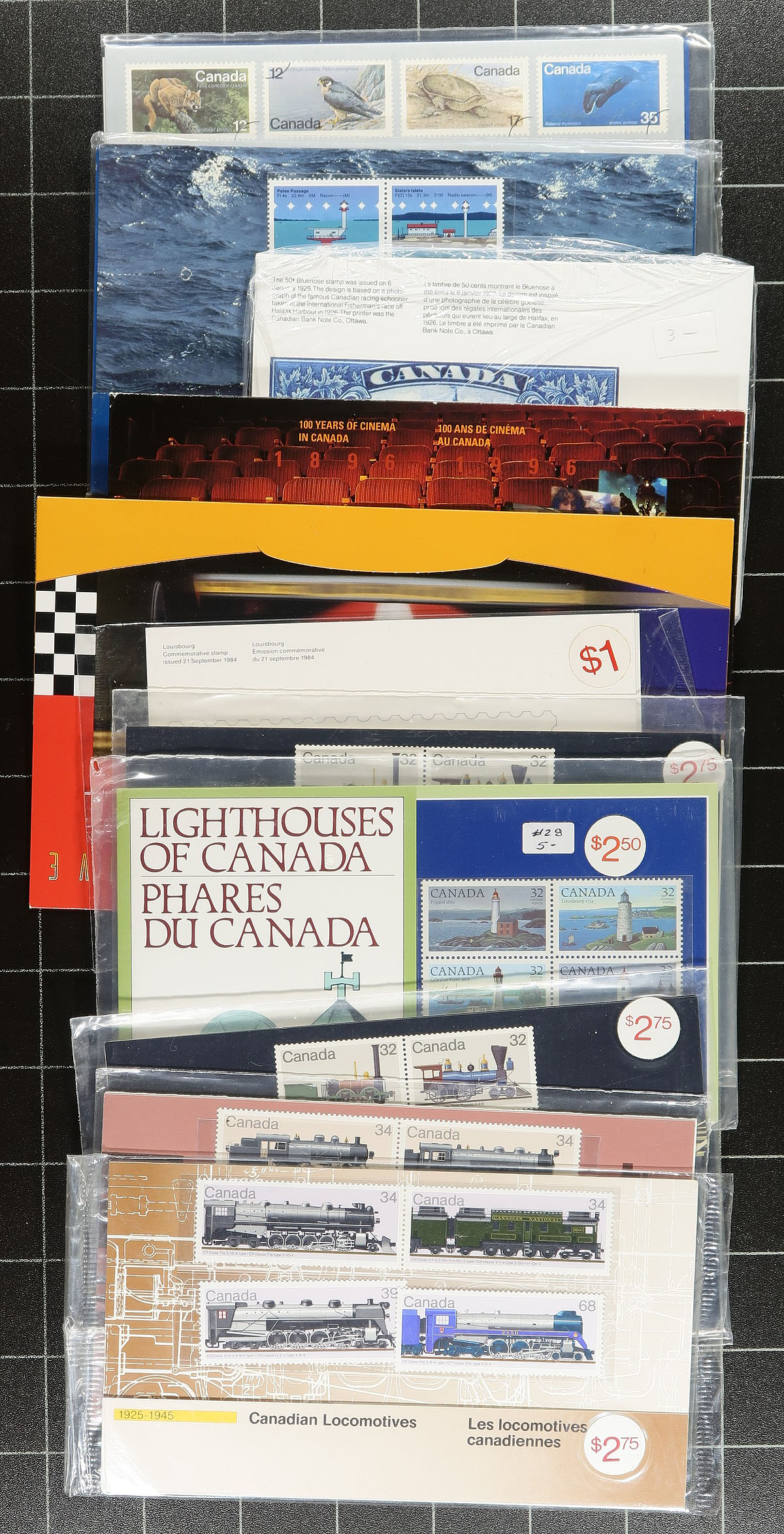 A "catch-all" large shoebox of Canadian Thematic Collections and other often neglected "back of the book" packages. Includes over 100 items, with early Year Sets, Thematic Collections, Promotional Items and even (and likely most interesting) a 1965 Christmas Post Office advertising window flyer (folded). Some of the other notable items are the "Purdys Chocolate envelope, Star Trek Prestige Booklet, Picture Postage P.O. Pack, $5.00 Toronto Maple Leafs Jersey pack and several other modern Post Office packs (including Star Trek). Unitrade has started to list many of these, but some remain unlisted and unpriced. Well worth the estimated value. Estimate =