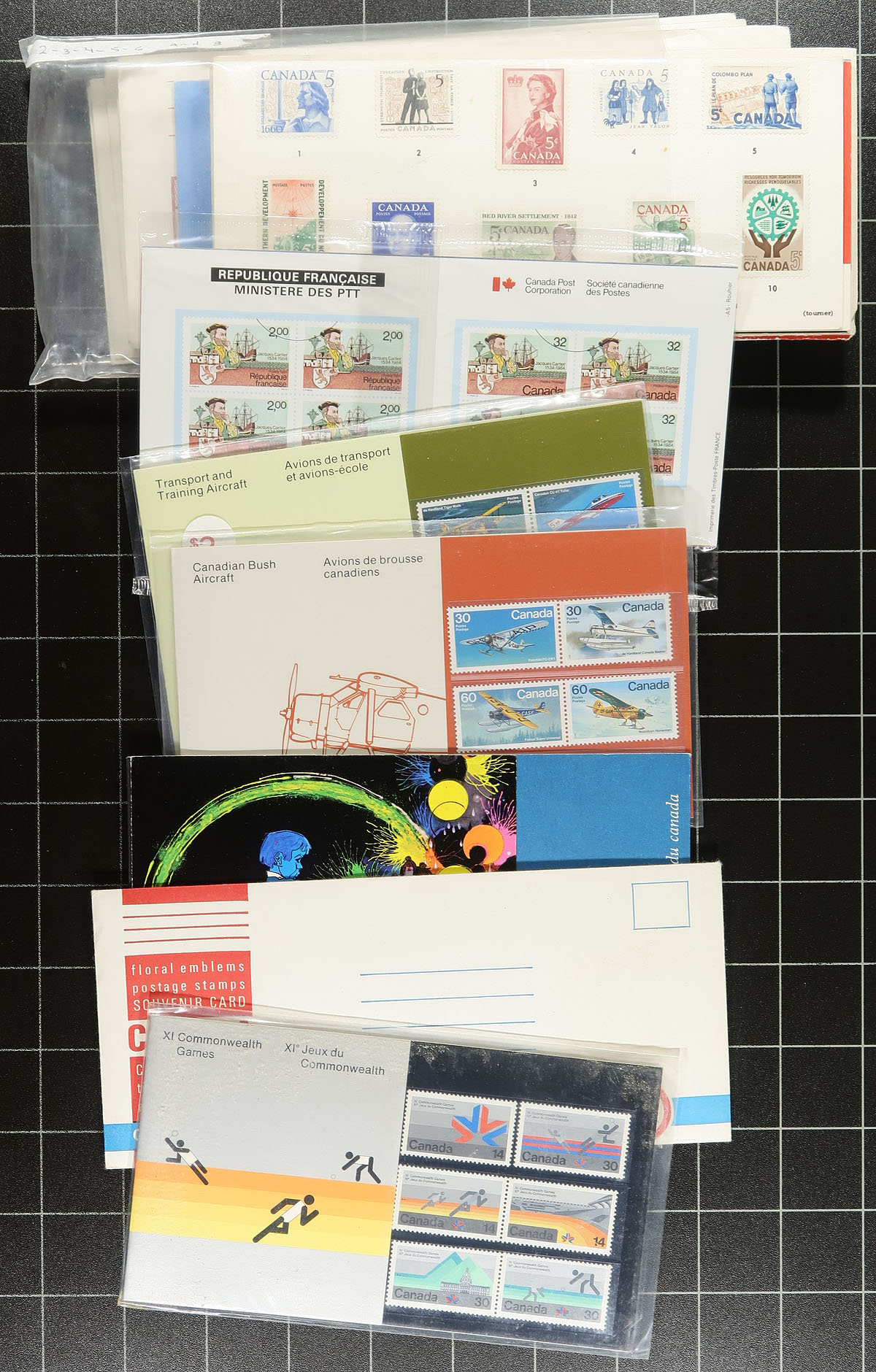 A "catch-all" large shoebox of Canadian Thematic Collections and other often neglected "back of the book" packages. Includes over 100 items, with early Year Sets, Thematic Collections, Promotional Items and even (and likely most interesting) a 1965 Christmas Post Office advertising window flyer (folded). Some of the other notable items are the "Purdys Chocolate envelope, Star Trek Prestige Booklet, Picture Postage P.O. Pack, $5.00 Toronto Maple Leafs Jersey pack and several other modern Post Office packs (including Star Trek). Unitrade has started to list many of these, but some remain unlisted and unpriced. Well worth the estimated value. Estimate =