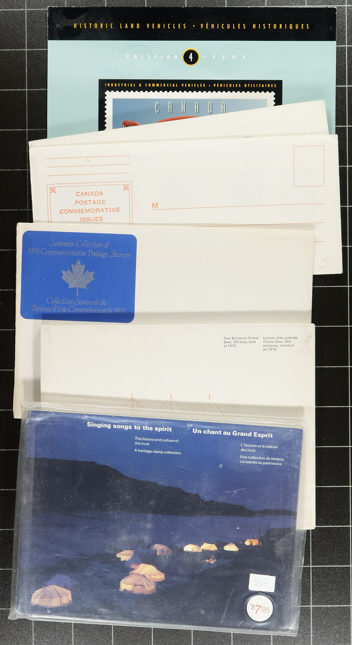 A "catch-all" large shoebox of Canadian Thematic Collections and other often neglected "back of the book" packages. Includes over 100 items, with early Year Sets, Thematic Collections, Promotional Items and even (and likely most interesting) a 1965 Christmas Post Office advertising window flyer (folded). Some of the other notable items are the "Purdys Chocolate envelope, Star Trek Prestige Booklet, Picture Postage P.O. Pack, $5.00 Toronto Maple Leafs Jersey pack and several other modern Post Office packs (including Star Trek). Unitrade has started to list many of these, but some remain unlisted and unpriced. Well worth the estimated value. Estimate =