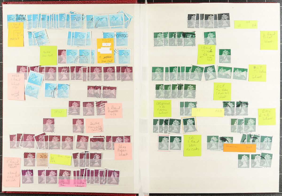 Bankers box of value, including (in no particular order)..1) Stanley Gibbons springback album for GB commemoratives 1924-1971 (1st Decimal issue), partially filled will used stamps, including regular and phosphor issues (a great start to a complete group). 2) Group of 5x stockbooks and 2x binders (with stocksheets) filled to varying extents but containing a mix of largely unsorted mix of QEII era mint and used, including Machins (including Regionals), Wildings, high-value "Castles" and commemorative issues. 3) Small box filled with unchecked QEII Machin issues, largely in baggies just awaiting a more intricate sort. 4) Lastly, a binder containing vario stocksheets containing an assortment of 27 USA flights / first flights (a bit different from the rest of the lot, but adding an interesting secondary aspect). Estimate =