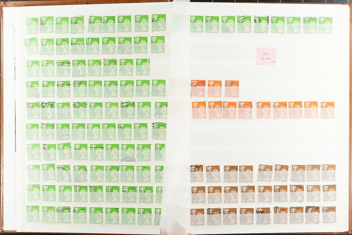 Bankers box of value, including (in no particular order)..1) Stanley Gibbons springback album for GB commemoratives 1924-1971 (1st Decimal issue), partially filled will used stamps, including regular and phosphor issues (a great start to a complete group). 2) Group of 5x stockbooks and 2x binders (with stocksheets) filled to varying extents but containing a mix of largely unsorted mix of QEII era mint and used, including Machins (including Regionals), Wildings, high-value "Castles" and commemorative issues. 3) Small box filled with unchecked QEII Machin issues, largely in baggies just awaiting a more intricate sort. 4) Lastly, a binder containing vario stocksheets containing an assortment of 27 USA flights / first flights (a bit different from the rest of the lot, but adding an interesting secondary aspect). Estimate =