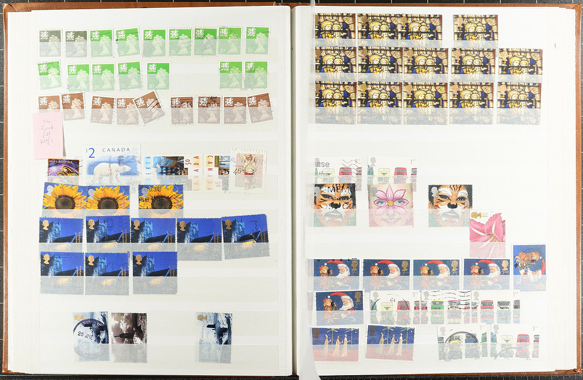 Bankers box of value, including (in no particular order)..1) Stanley Gibbons springback album for GB commemoratives 1924-1971 (1st Decimal issue), partially filled will used stamps, including regular and phosphor issues (a great start to a complete group). 2) Group of 5x stockbooks and 2x binders (with stocksheets) filled to varying extents but containing a mix of largely unsorted mix of QEII era mint and used, including Machins (including Regionals), Wildings, high-value "Castles" and commemorative issues. 3) Small box filled with unchecked QEII Machin issues, largely in baggies just awaiting a more intricate sort. 4) Lastly, a binder containing vario stocksheets containing an assortment of 27 USA flights / first flights (a bit different from the rest of the lot, but adding an interesting secondary aspect). Estimate =