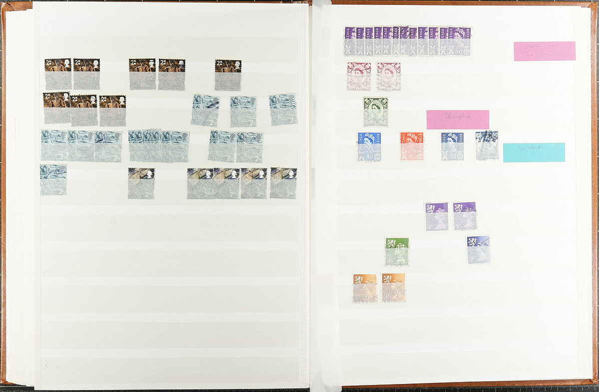 Bankers box of value, including (in no particular order)..1) Stanley Gibbons springback album for GB commemoratives 1924-1971 (1st Decimal issue), partially filled will used stamps, including regular and phosphor issues (a great start to a complete group). 2) Group of 5x stockbooks and 2x binders (with stocksheets) filled to varying extents but containing a mix of largely unsorted mix of QEII era mint and used, including Machins (including Regionals), Wildings, high-value "Castles" and commemorative issues. 3) Small box filled with unchecked QEII Machin issues, largely in baggies just awaiting a more intricate sort. 4) Lastly, a binder containing vario stocksheets containing an assortment of 27 USA flights / first flights (a bit different from the rest of the lot, but adding an interesting secondary aspect). Estimate =