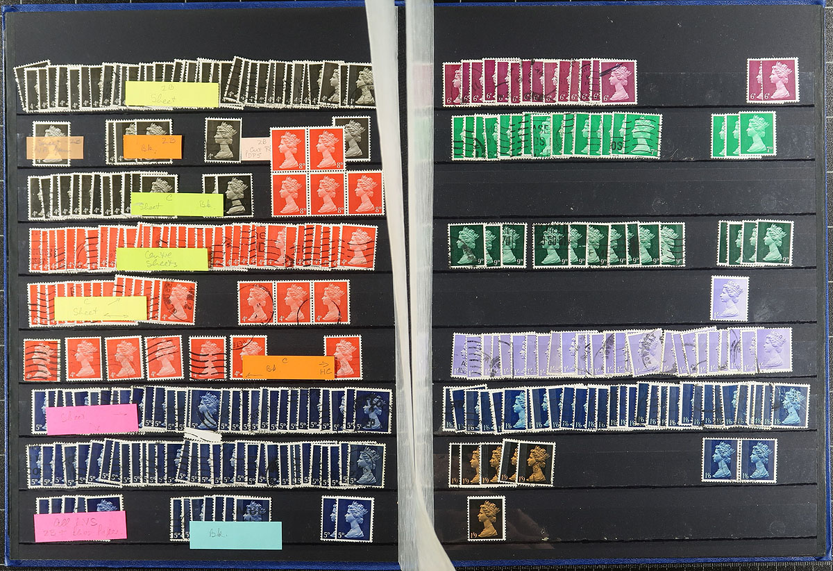 Bankers box of value, including (in no particular order)..1) Stanley Gibbons springback album for GB commemoratives 1924-1971 (1st Decimal issue), partially filled will used stamps, including regular and phosphor issues (a great start to a complete group). 2) Group of 5x stockbooks and 2x binders (with stocksheets) filled to varying extents but containing a mix of largely unsorted mix of QEII era mint and used, including Machins (including Regionals), Wildings, high-value "Castles" and commemorative issues. 3) Small box filled with unchecked QEII Machin issues, largely in baggies just awaiting a more intricate sort. 4) Lastly, a binder containing vario stocksheets containing an assortment of 27 USA flights / first flights (a bit different from the rest of the lot, but adding an interesting secondary aspect). Estimate =