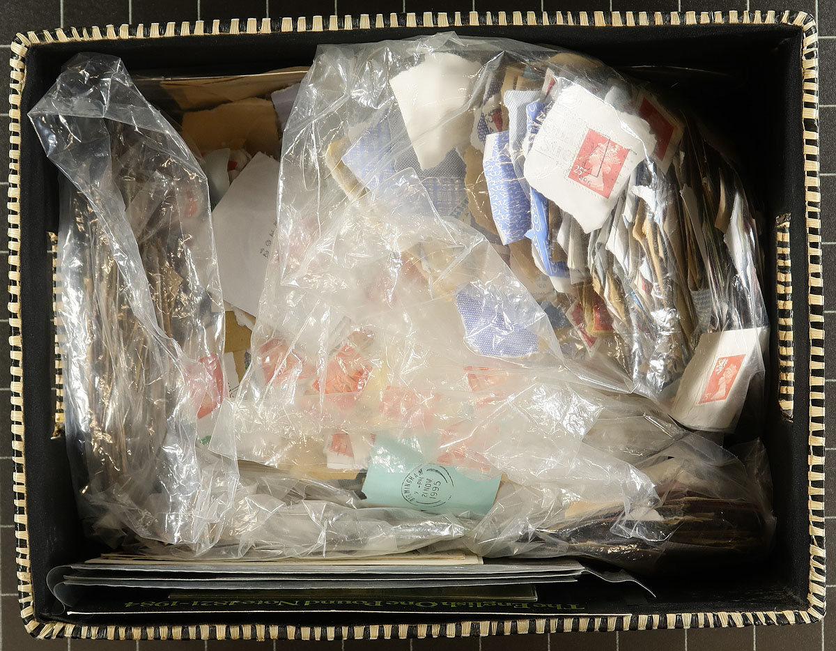 Bankers box of value, including (in no particular order)..1) Stanley Gibbons springback album for GB commemoratives 1924-1971 (1st Decimal issue), partially filled will used stamps, including regular and phosphor issues (a great start to a complete group). 2) Group of 5x stockbooks and 2x binders (with stocksheets) filled to varying extents but containing a mix of largely unsorted mix of QEII era mint and used, including Machins (including Regionals), Wildings, high-value "Castles" and commemorative issues. 3) Small box filled with unchecked QEII Machin issues, largely in baggies just awaiting a more intricate sort. 4) Lastly, a binder containing vario stocksheets containing an assortment of 27 USA flights / first flights (a bit different from the rest of the lot, but adding an interesting secondary aspect). Estimate =