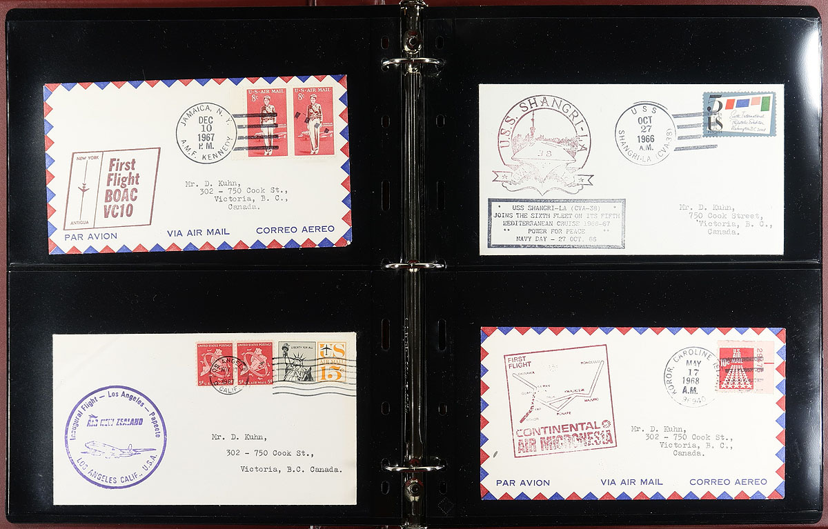 Bankers box of value, including (in no particular order)..1) Stanley Gibbons springback album for GB commemoratives 1924-1971 (1st Decimal issue), partially filled will used stamps, including regular and phosphor issues (a great start to a complete group). 2) Group of 5x stockbooks and 2x binders (with stocksheets) filled to varying extents but containing a mix of largely unsorted mix of QEII era mint and used, including Machins (including Regionals), Wildings, high-value "Castles" and commemorative issues. 3) Small box filled with unchecked QEII Machin issues, largely in baggies just awaiting a more intricate sort. 4) Lastly, a binder containing vario stocksheets containing an assortment of 27 USA flights / first flights (a bit different from the rest of the lot, but adding an interesting secondary aspect). Estimate =