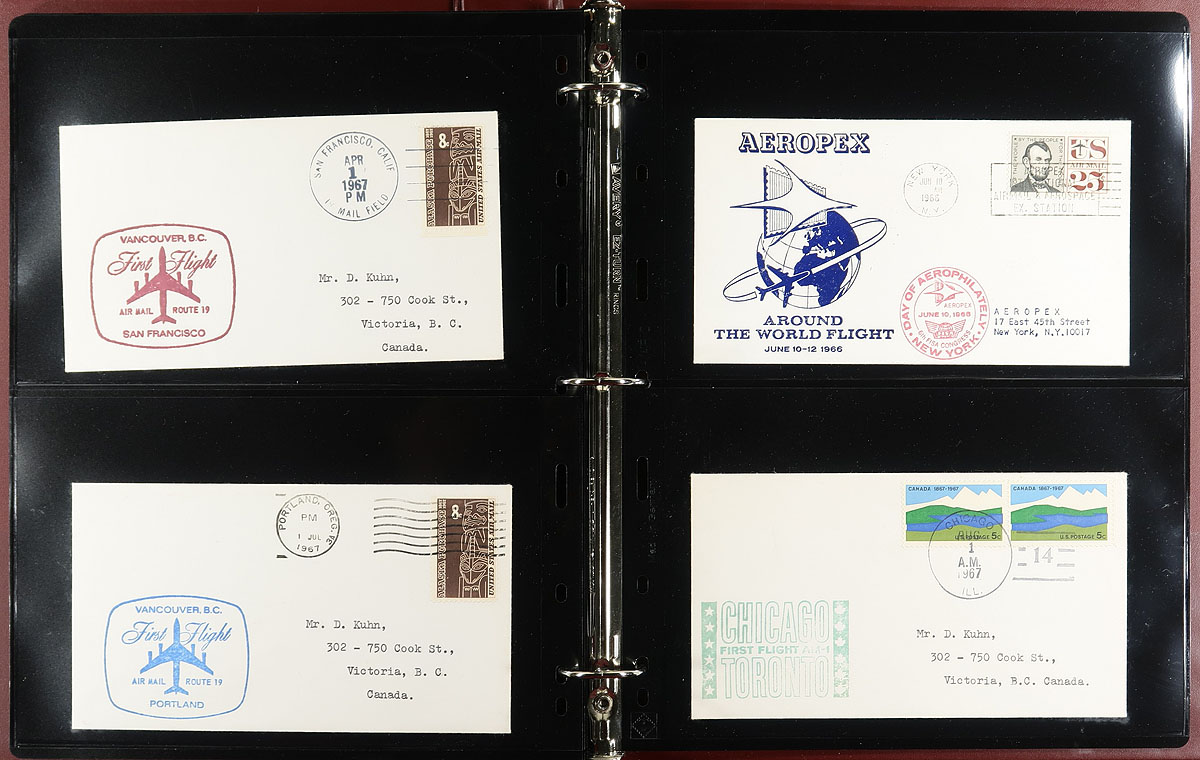Bankers box of value, including (in no particular order)..1) Stanley Gibbons springback album for GB commemoratives 1924-1971 (1st Decimal issue), partially filled will used stamps, including regular and phosphor issues (a great start to a complete group). 2) Group of 5x stockbooks and 2x binders (with stocksheets) filled to varying extents but containing a mix of largely unsorted mix of QEII era mint and used, including Machins (including Regionals), Wildings, high-value "Castles" and commemorative issues. 3) Small box filled with unchecked QEII Machin issues, largely in baggies just awaiting a more intricate sort. 4) Lastly, a binder containing vario stocksheets containing an assortment of 27 USA flights / first flights (a bit different from the rest of the lot, but adding an interesting secondary aspect). Estimate =