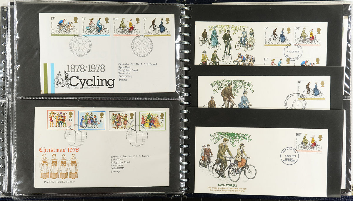 First Day Cover Collection / Accumulation Part 1. Box filled with over 425 First Day Covers, 1967-1996, organized by year into six albums (along with loose material). We noted singles, sets, blocks, souvenir sheets and high-values and regional issues. Overall very clean material, which would have had a tremendous initial cost. Estimate =