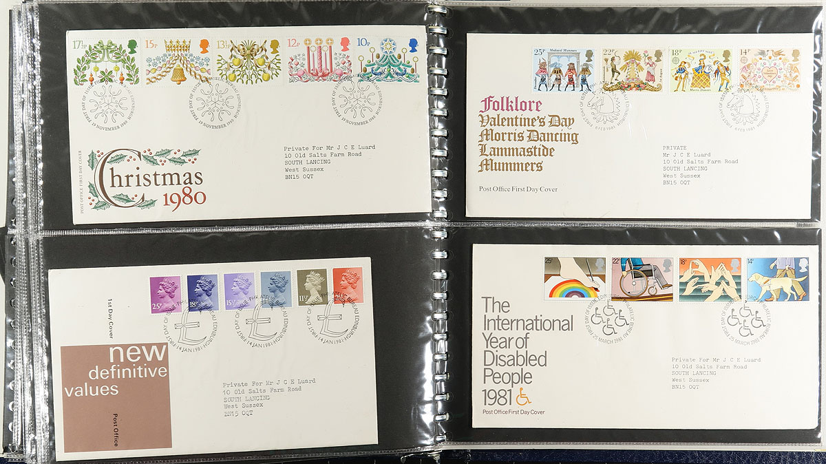 First Day Cover Collection / Accumulation Part 1. Box filled with over 425 First Day Covers, 1967-1996, organized by year into six albums (along with loose material). We noted singles, sets, blocks, souvenir sheets and high-values and regional issues. Overall very clean material, which would have had a tremendous initial cost. Estimate =