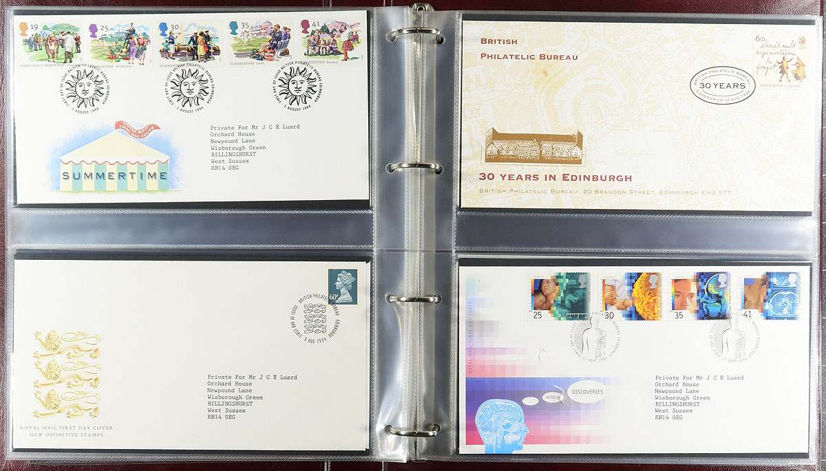 First Day Cover Collection / Accumulation Part 1. Box filled with over 425 First Day Covers, 1967-1996, organized by year into six albums (along with loose material). We noted singles, sets, blocks, souvenir sheets and high-values and regional issues. Overall very clean material, which would have had a tremendous initial cost. Estimate =