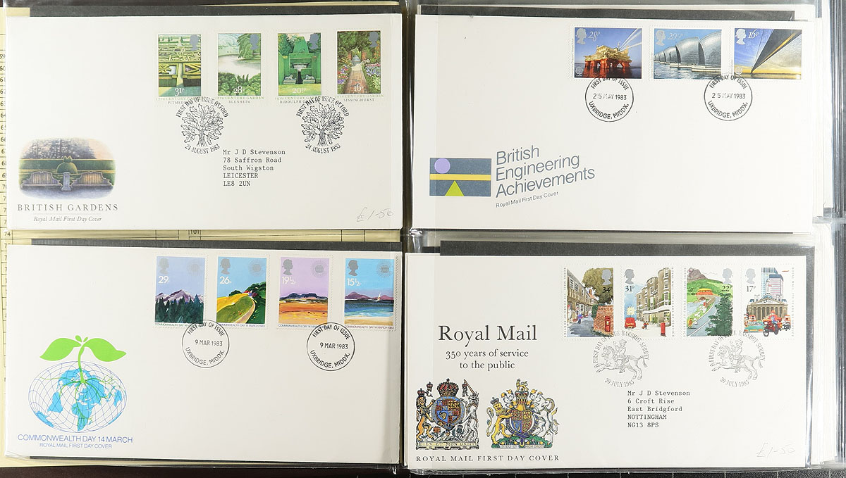 First Day Cover Collection / Accumulation Part 1. Box filled with over 425 First Day Covers, 1967-1996, organized by year into six albums (along with loose material). We noted singles, sets, blocks, souvenir sheets and high-values and regional issues. Overall very clean material, which would have had a tremendous initial cost. Estimate =