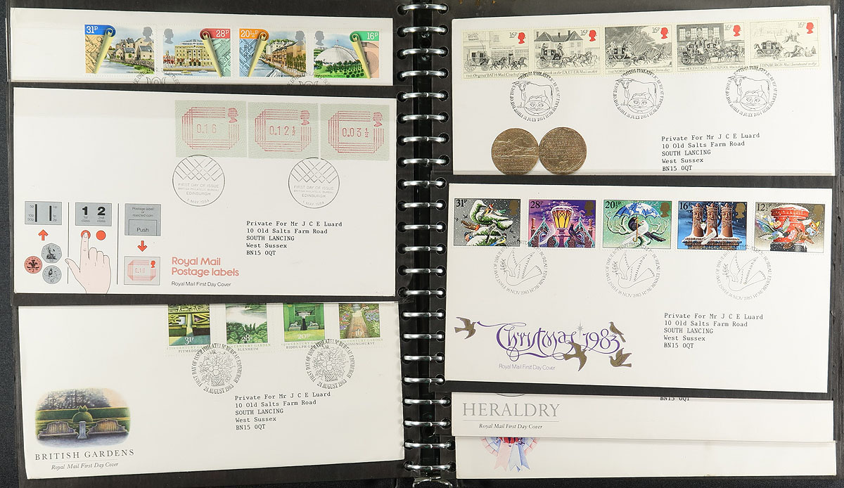 First Day Cover Collection / Accumulation Part 1. Box filled with over 425 First Day Covers, 1967-1996, organized by year into six albums (along with loose material). We noted singles, sets, blocks, souvenir sheets and high-values and regional issues. Overall very clean material, which would have had a tremendous initial cost. Estimate =