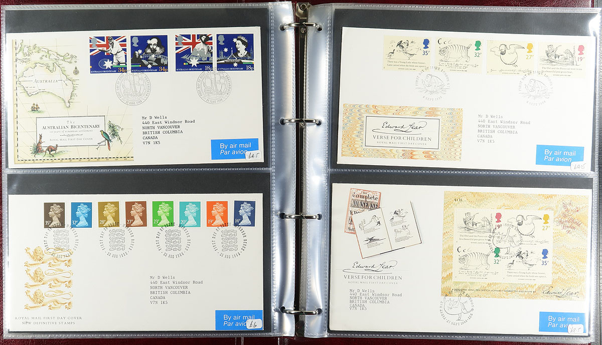 First Day Cover Collection / Accumulation Part 2. Box filled with approximately 400 First Day Covers from the 1960-2000 period, arranged in 7 albums. We noted singles, souvenir sheet and sets, with many attractive topical issues that the British Post Office has been renowned for. Better items (catalogued by 2023 Stanley Gibbons Concise), include #161-164 (catalogue £75.00), #180-181 (catalogue £50.00), #191-193 (two covers, catalogue £90.00) and a few others that catalogue £10-30 each. Estimate =
