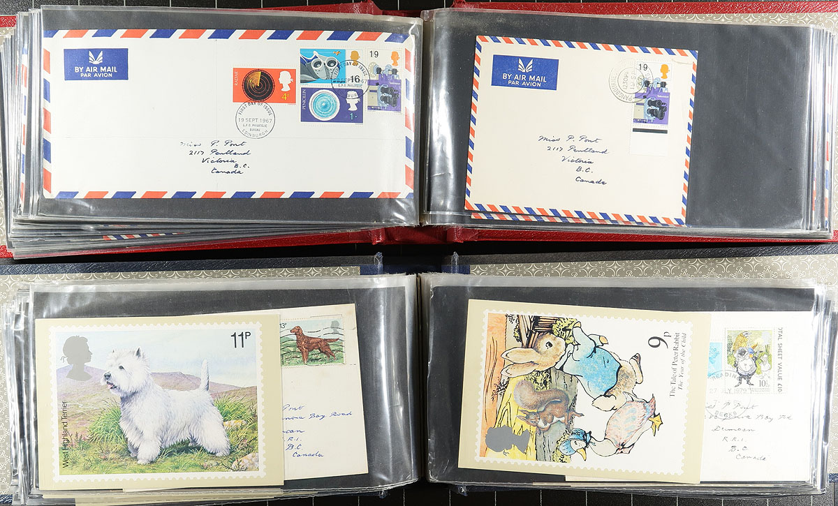 First Day Cover Collection / Accumulation Part 3. A duo of boxes, filled with 14 cover albums that feature over 1200 First Day Covers, from the 1950-1991 period. The majority of these covers are addressed to Canada, with singles, sets, plate blocks and souvenir sheets noted throughout. A few small faults in the earlier material (toning, corner bends), but overall a very enticing run of material. Estimate =