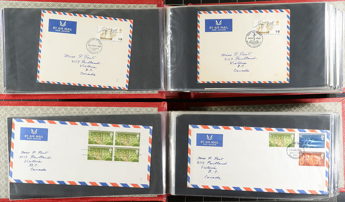 First Day Cover Collection / Accumulation Part 3. A duo of boxes, filled with 14 cover albums that feature over 1200 First Day Covers, from the 1950-1991 period. The majority of these covers are addressed to Canada, with singles, sets, plate blocks and souvenir sheets noted throughout. A few small faults in the earlier material (toning, corner bends), but overall a very enticing run of material. Estimate =