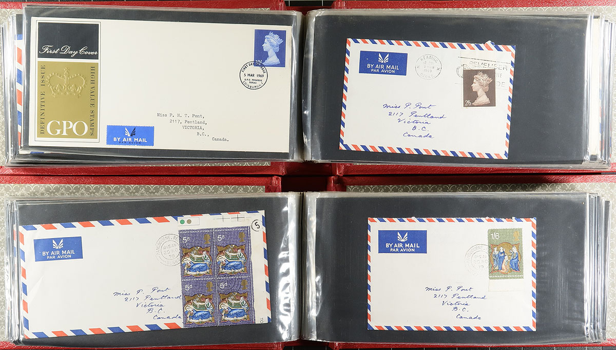 First Day Cover Collection / Accumulation Part 3. A duo of boxes, filled with 14 cover albums that feature over 1200 First Day Covers, from the 1950-1991 period. The majority of these covers are addressed to Canada, with singles, sets, plate blocks and souvenir sheets noted throughout. A few small faults in the earlier material (toning, corner bends), but overall a very enticing run of material. Estimate =