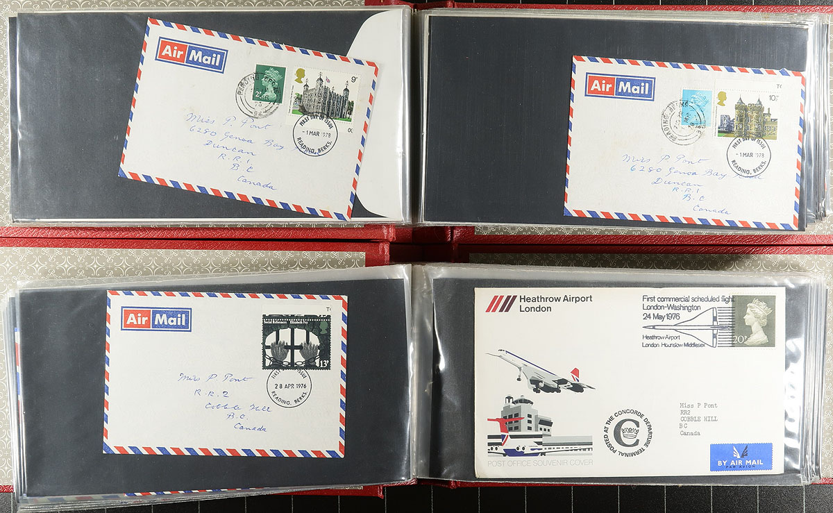 First Day Cover Collection / Accumulation Part 3. A duo of boxes, filled with 14 cover albums that feature over 1200 First Day Covers, from the 1950-1991 period. The majority of these covers are addressed to Canada, with singles, sets, plate blocks and souvenir sheets noted throughout. A few small faults in the earlier material (toning, corner bends), but overall a very enticing run of material. Estimate =