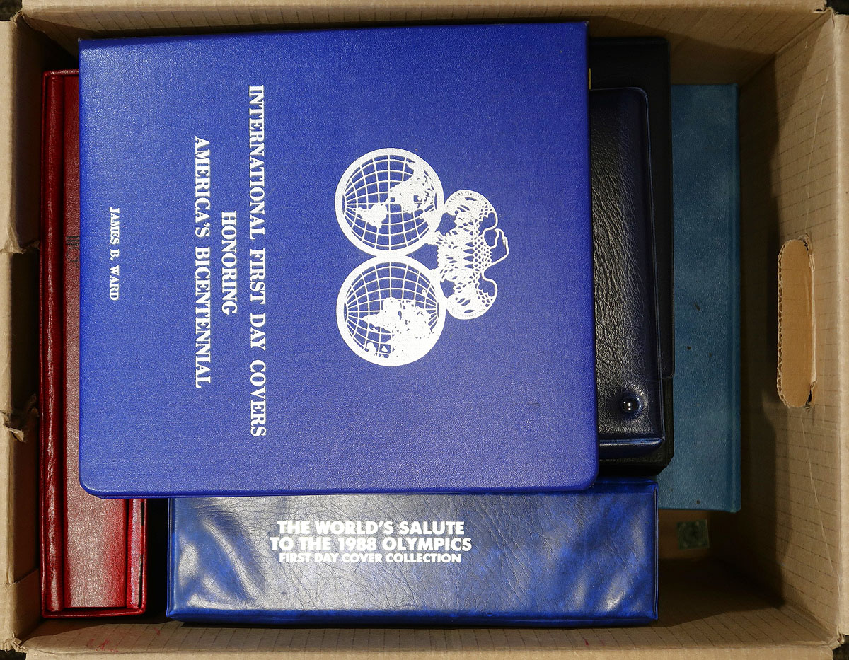 Box of "Curated" Topical collections, including "The History of Aviation" with 50 First Day Covers, each mounted on its own page (circa 1978). Keeping with the transportation theme, there is a pair of pocket albums with Train stamps, circa 1985 (often Caribbean in a pair on a page with an extensive description of the train). Next topic is Olympics sports (a first day collection for the 1980 Moscow and another for the 1988 Summer and Winter games). For animal collectors there is a pair of albums produced for the World Wildlife Fund circa 1980 (mint stamp/set with matching maxi-card and FDC). Finally, there is a thin volume with non-US countries commemorating the United States’ 1976 Bicentennial on FDCs. These sets had outrageous original costs, often targeted at non-collectors or as "investments". They have significant value still when broken up for retail sale. Estimate =