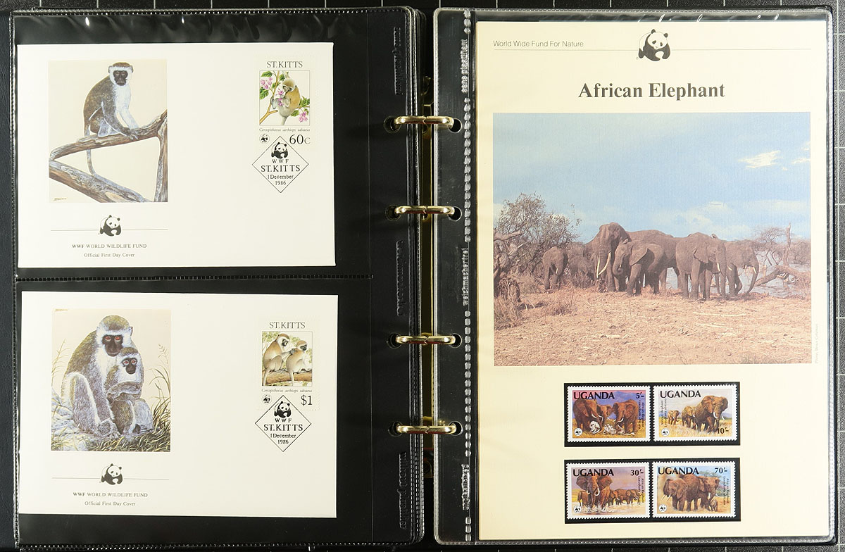 Box of "Curated" Topical collections, including "The History of Aviation" with 50 First Day Covers, each mounted on its own page (circa 1978). Keeping with the transportation theme, there is a pair of pocket albums with Train stamps, circa 1985 (often Caribbean in a pair on a page with an extensive description of the train). Next topic is Olympics sports (a first day collection for the 1980 Moscow and another for the 1988 Summer and Winter games). For animal collectors there is a pair of albums produced for the World Wildlife Fund circa 1980 (mint stamp/set with matching maxi-card and FDC). Finally, there is a thin volume with non-US countries commemorating the United States’ 1976 Bicentennial on FDCs. These sets had outrageous original costs, often targeted at non-collectors or as "investments". They have significant value still when broken up for retail sale. Estimate =