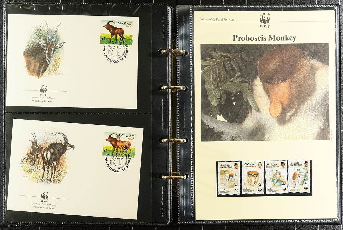 Box of "Curated" Topical collections, including "The History of Aviation" with 50 First Day Covers, each mounted on its own page (circa 1978). Keeping with the transportation theme, there is a pair of pocket albums with Train stamps, circa 1985 (often Caribbean in a pair on a page with an extensive description of the train). Next topic is Olympics sports (a first day collection for the 1980 Moscow and another for the 1988 Summer and Winter games). For animal collectors there is a pair of albums produced for the World Wildlife Fund circa 1980 (mint stamp/set with matching maxi-card and FDC). Finally, there is a thin volume with non-US countries commemorating the United States’ 1976 Bicentennial on FDCs. These sets had outrageous original costs, often targeted at non-collectors or as "investments". They have significant value still when broken up for retail sale. Estimate =