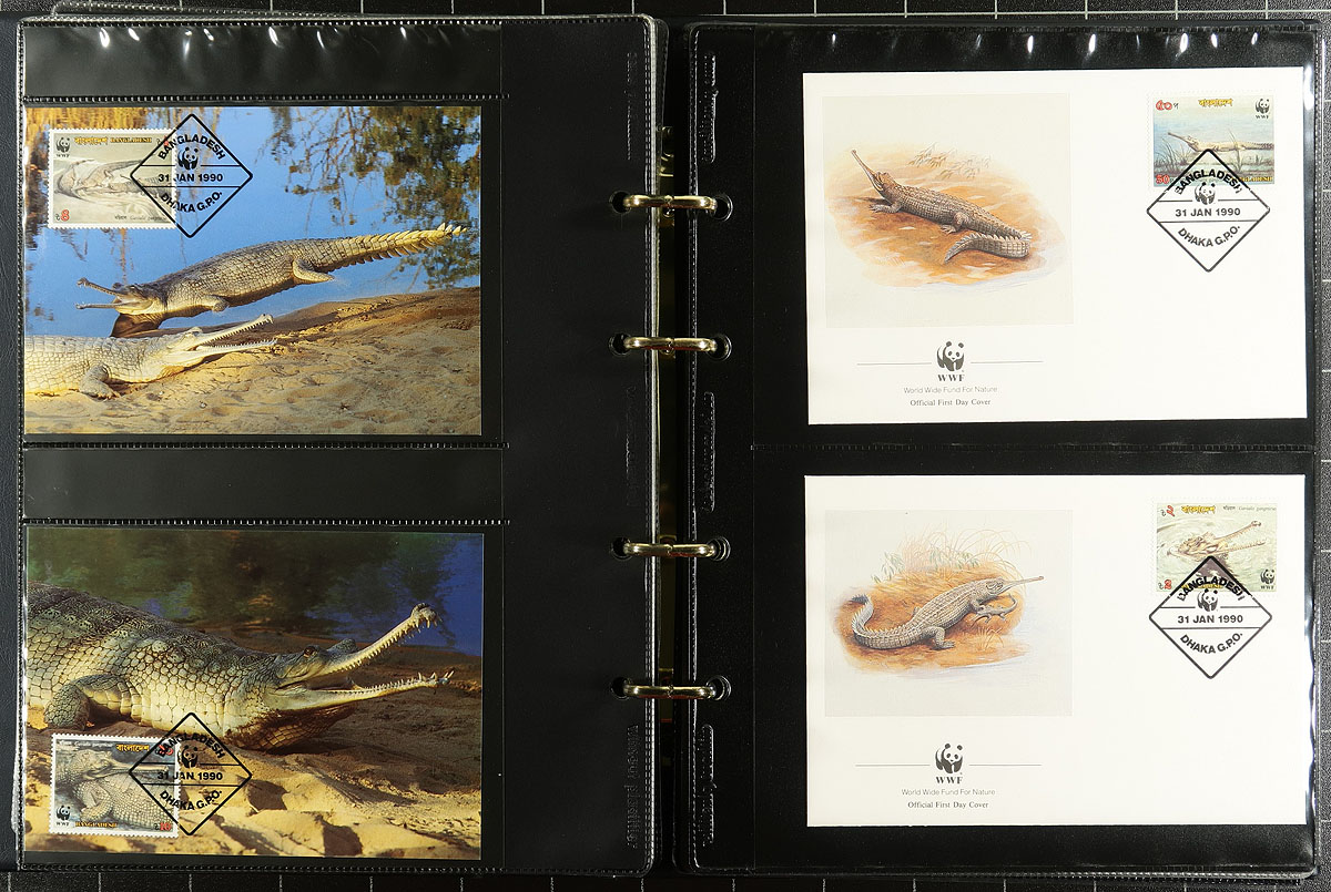 Box of "Curated" Topical collections, including "The History of Aviation" with 50 First Day Covers, each mounted on its own page (circa 1978). Keeping with the transportation theme, there is a pair of pocket albums with Train stamps, circa 1985 (often Caribbean in a pair on a page with an extensive description of the train). Next topic is Olympics sports (a first day collection for the 1980 Moscow and another for the 1988 Summer and Winter games). For animal collectors there is a pair of albums produced for the World Wildlife Fund circa 1980 (mint stamp/set with matching maxi-card and FDC). Finally, there is a thin volume with non-US countries commemorating the United States’ 1976 Bicentennial on FDCs. These sets had outrageous original costs, often targeted at non-collectors or as "investments". They have significant value still when broken up for retail sale. Estimate =