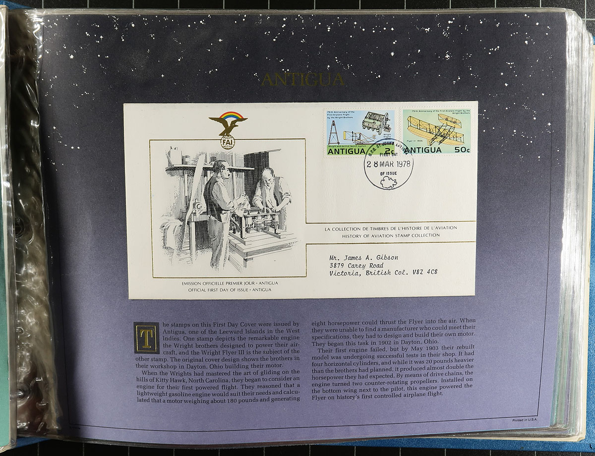 Box of "Curated" Topical collections, including "The History of Aviation" with 50 First Day Covers, each mounted on its own page (circa 1978). Keeping with the transportation theme, there is a pair of pocket albums with Train stamps, circa 1985 (often Caribbean in a pair on a page with an extensive description of the train). Next topic is Olympics sports (a first day collection for the 1980 Moscow and another for the 1988 Summer and Winter games). For animal collectors there is a pair of albums produced for the World Wildlife Fund circa 1980 (mint stamp/set with matching maxi-card and FDC). Finally, there is a thin volume with non-US countries commemorating the United States’ 1976 Bicentennial on FDCs. These sets had outrageous original costs, often targeted at non-collectors or as "investments". They have significant value still when broken up for retail sale. Estimate =