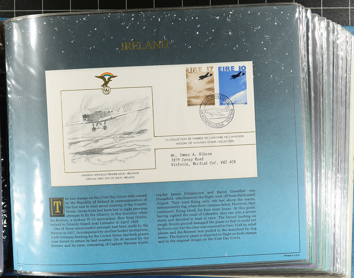 Box of "Curated" Topical collections, including "The History of Aviation" with 50 First Day Covers, each mounted on its own page (circa 1978). Keeping with the transportation theme, there is a pair of pocket albums with Train stamps, circa 1985 (often Caribbean in a pair on a page with an extensive description of the train). Next topic is Olympics sports (a first day collection for the 1980 Moscow and another for the 1988 Summer and Winter games). For animal collectors there is a pair of albums produced for the World Wildlife Fund circa 1980 (mint stamp/set with matching maxi-card and FDC). Finally, there is a thin volume with non-US countries commemorating the United States’ 1976 Bicentennial on FDCs. These sets had outrageous original costs, often targeted at non-collectors or as "investments". They have significant value still when broken up for retail sale. Estimate =