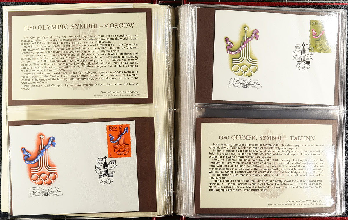 Box of "Curated" Topical collections, including "The History of Aviation" with 50 First Day Covers, each mounted on its own page (circa 1978). Keeping with the transportation theme, there is a pair of pocket albums with Train stamps, circa 1985 (often Caribbean in a pair on a page with an extensive description of the train). Next topic is Olympics sports (a first day collection for the 1980 Moscow and another for the 1988 Summer and Winter games). For animal collectors there is a pair of albums produced for the World Wildlife Fund circa 1980 (mint stamp/set with matching maxi-card and FDC). Finally, there is a thin volume with non-US countries commemorating the United States’ 1976 Bicentennial on FDCs. These sets had outrageous original costs, often targeted at non-collectors or as "investments". They have significant value still when broken up for retail sale. Estimate =